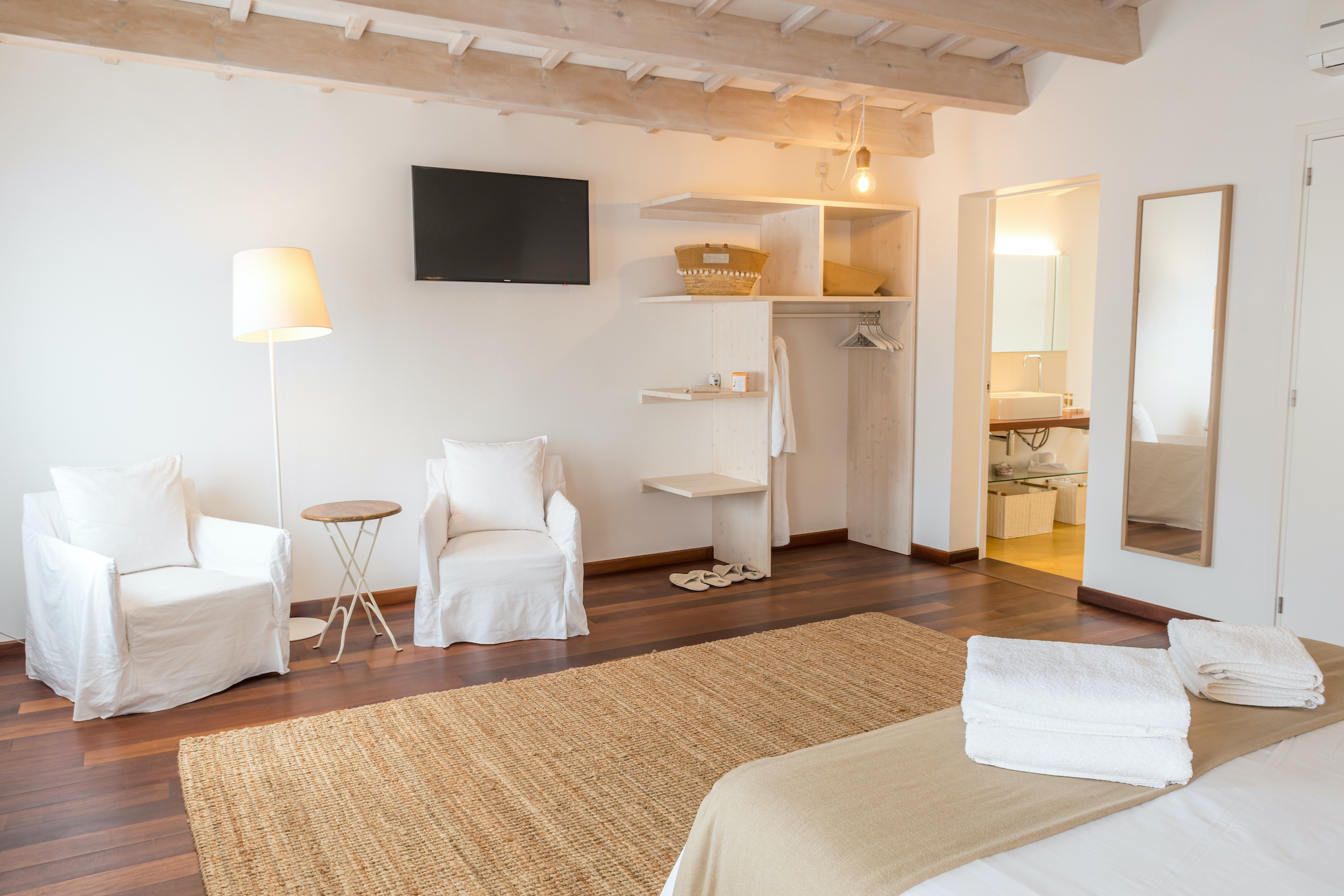 Proveniente del sur, el siroco da nombre a otra de las estancias de Ca s’Arader. La calidez es, haciendo honor al viento que la apadrina, una de las principales características de esta habitación. Al igual que las otras tres, dispone de cama doble (1,80m x 2m), televisión con pantalla de LCD, acceso gratuito a internet (wifi), aire acondicionado, calefacción, baño con bañera y secador de pelo.