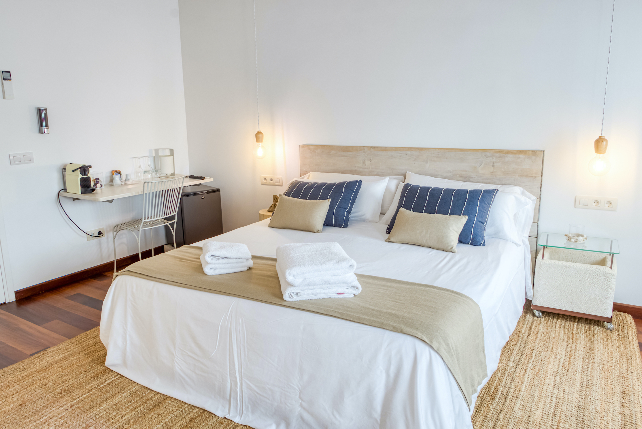 La tramontana, el viento más característico de Menorca, da nombre a la cuarta habitación del hotel. Algo más pequeña que las demás, esta habitación guarda un pequeño tesoro: una coqueta terraza de uso privado. Dispone de cama doble (1,80m x 2m), televisión con pantalla de LCD, acceso gratuito a internet (wifi), aire acondicionado, calefacción, baño con ducha y secador de pelo.